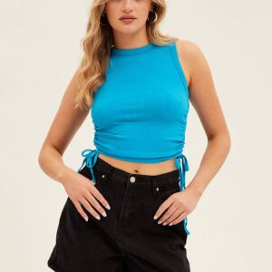 Blue Ruched Tank Top Crew Neck Seamless