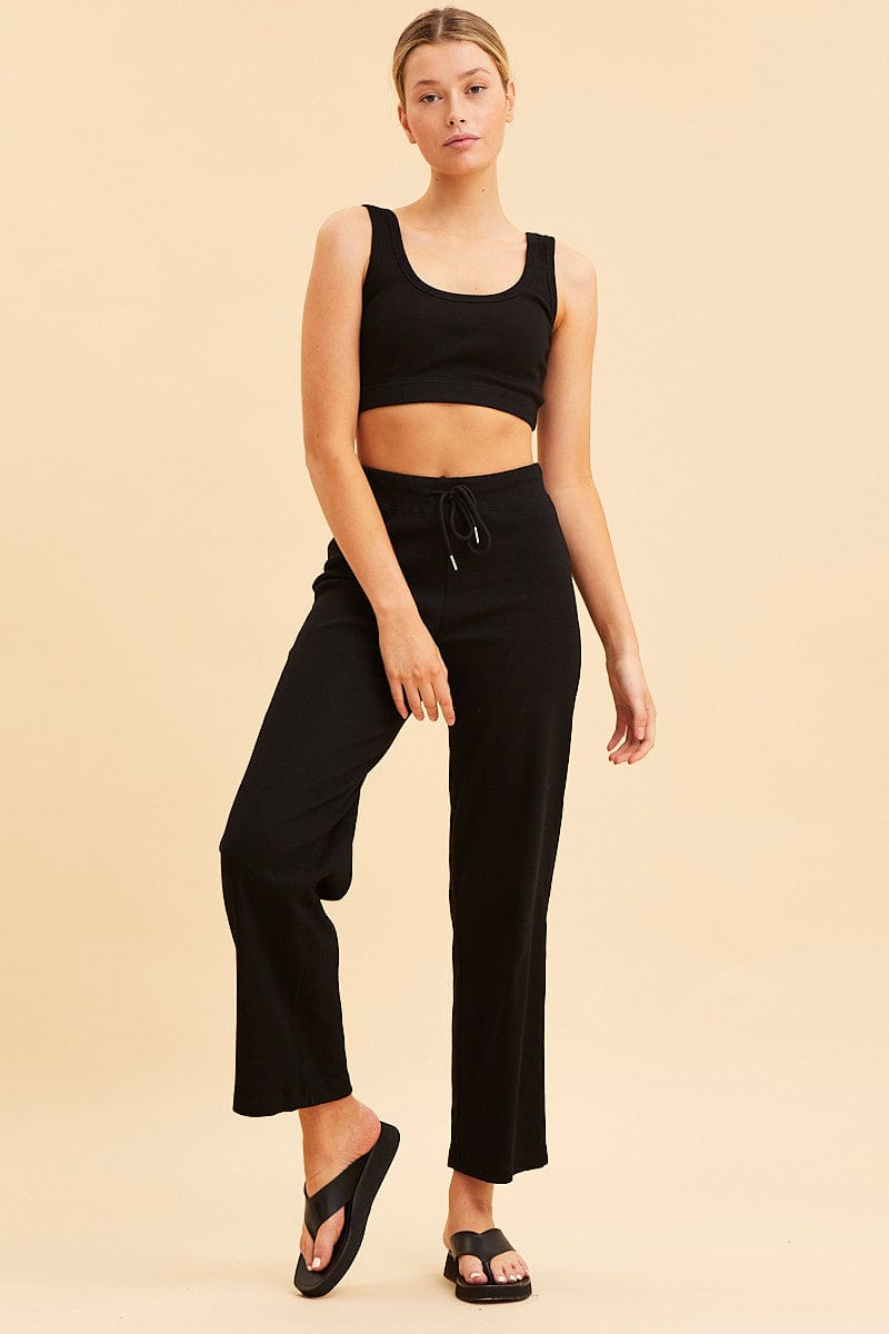 Black Crop Top Cotton Blend Rib Tank Elasticated Hem