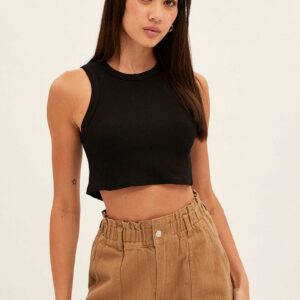 Black Crop Top Cotton Blend Rib Tank Elasticated Hem