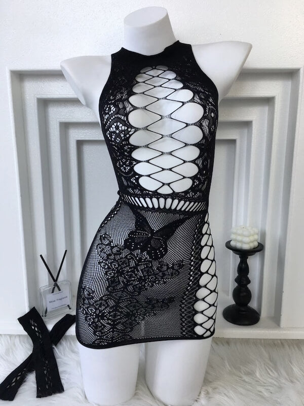 One Set 5 Pieces including 1. Y2k suspender red dress; 2. Butterfly hollow-out mesh dress with arm sleeves; 3. Gothic punk spiked headband; 4. Punk ring chain choker; 5. Lace suspender tights.