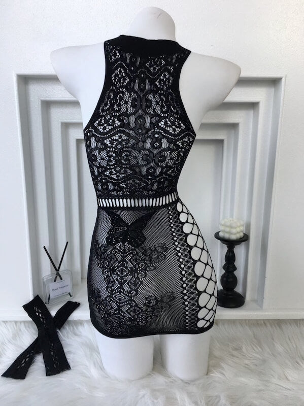 Step into edgy elegance with this Y2K-inspired look. The suspender red dress features lace trim and black lace-up strings, layered over a Butterfly hollow-out mesh dress with arm sleeves for a touch of ethereal charm. A Gothic punk spiked headband and Punk ring chain choker add rebellious flair, while Floral lace suspender stockings complete the ensemble with romantic allure. This outfit is perfect for those who blend softness with strength, creating a style that*s both bold and timeless.