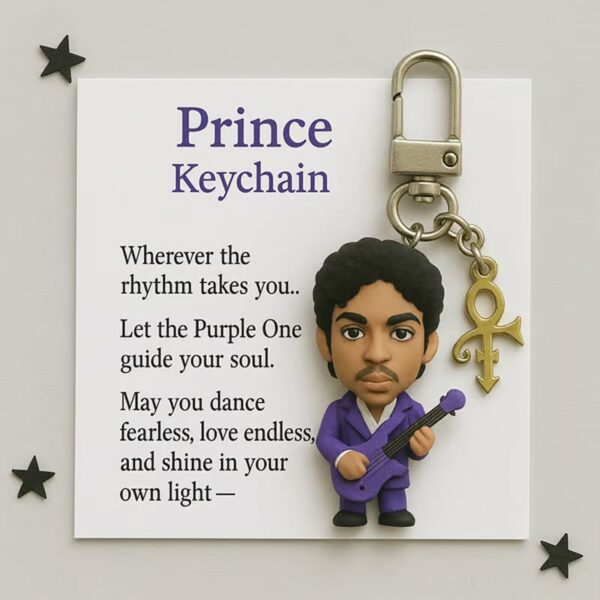 🌟 More than just a keychain, it’s a symbol of fearless expression. The purple suit, iconic symbol charm, and rose details aren’t just decorations—they’re the spiritual imprint left by Prince, reminding you to shine in your own light. 🌹⚡