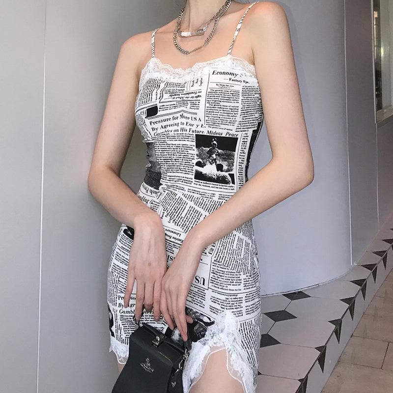 Hem lace newspaper print slit cami dress